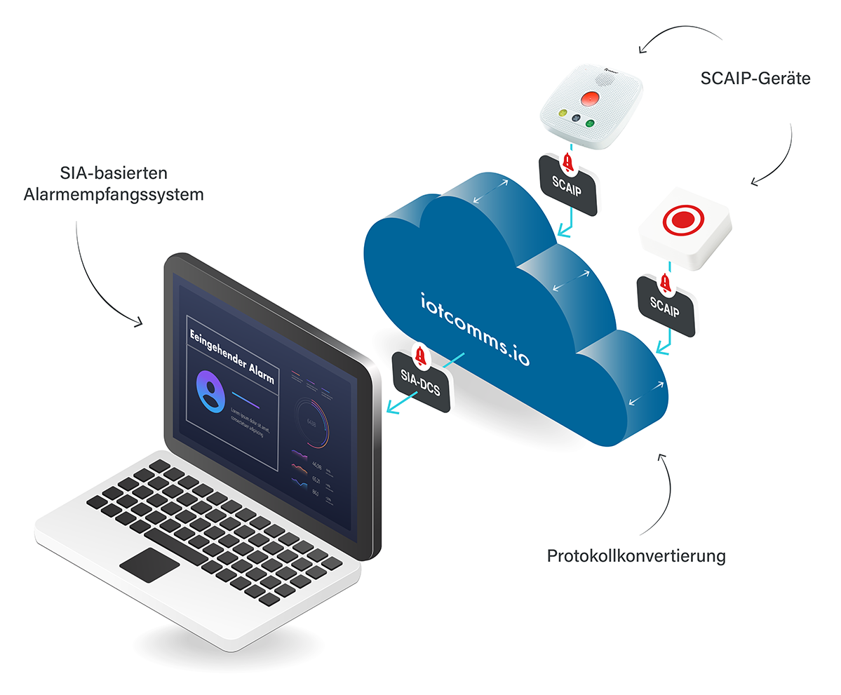 Der Alarmbridge-Service von iotcomms.io konvertiert Alarme von SCAIP-basierten Hausnotrufgeräten ins SIA-DCS-Format und übermittelt sie direkt an Ihr Alarmempfangsstelle.