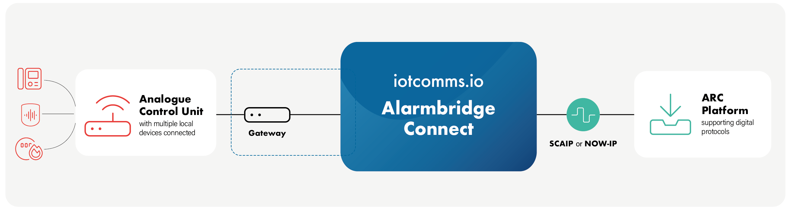 iotcomms.io’s Alarmbridge Connect Service transmits analog alarm communication reliably and securely over Internet by connecting a warden call system’s control unit to a Gateway. The alarm communication is converted to a digital protocol (SCAIP or NOW-IP) and delivered to the destined ARC.