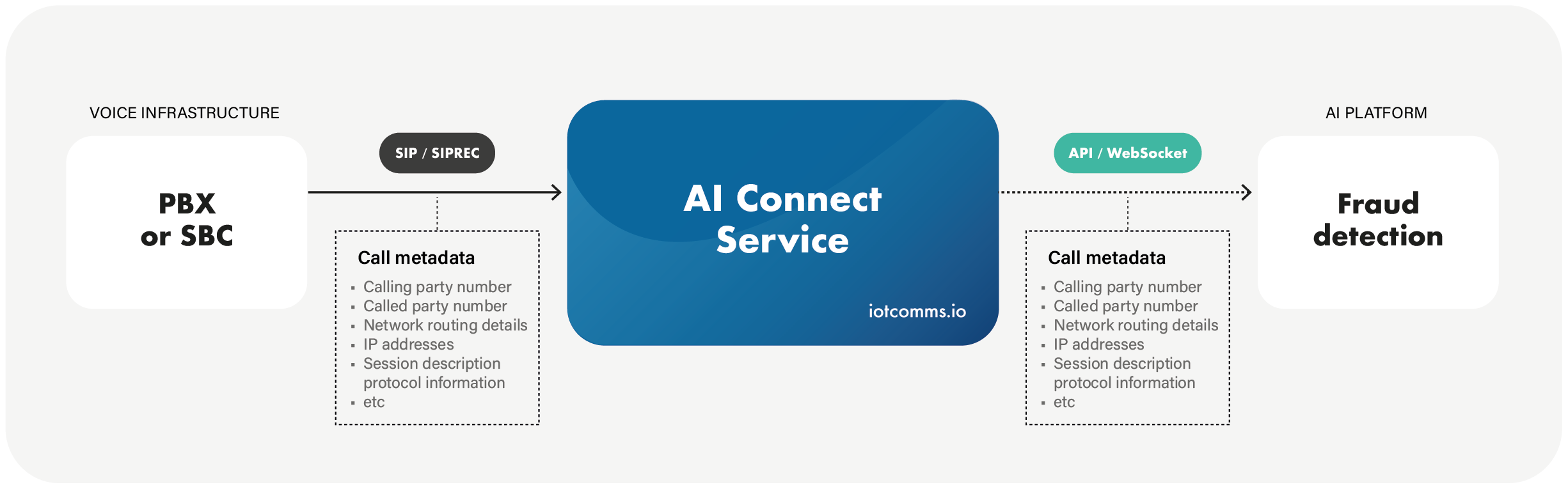 The AI Connect Service acts as the bridge between the voice infrastructure and AI environment, delivering call metadata in real time to power fraud detection use cases.
