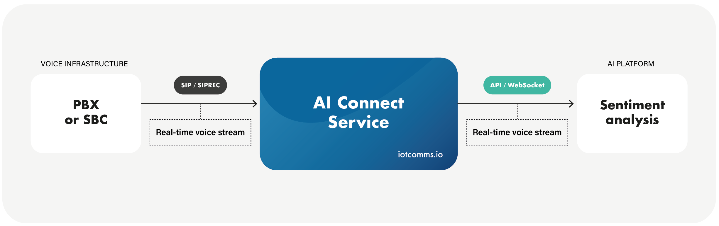 The AI Connect Service streams voice and call metadata directly to your AI platform, enabling instant sentiment detection for live customer interactions.