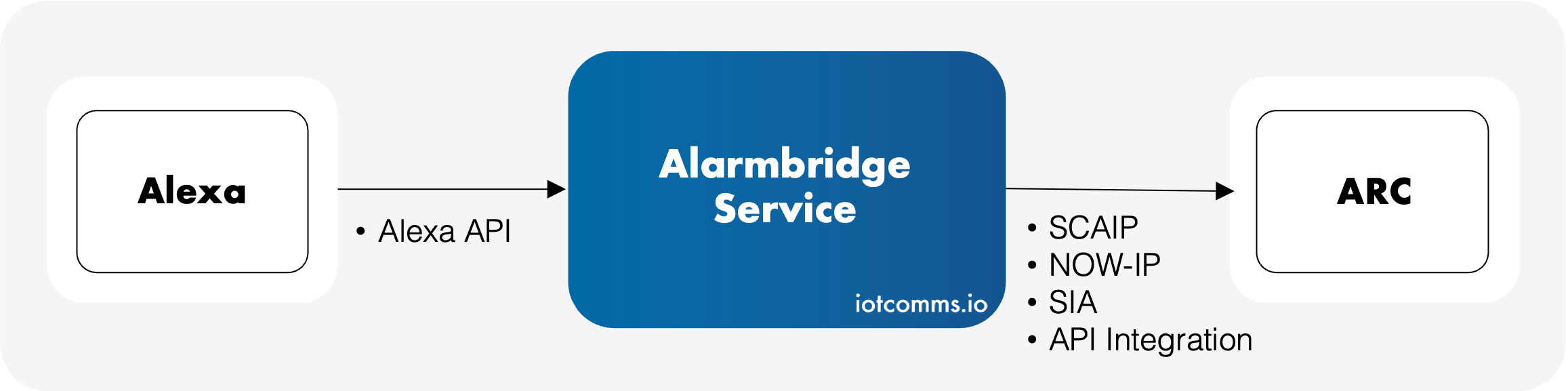 With built-in support for the Alexa API, the Alarmbridge Service enables Alexa speakers to communicate seamlessly with any ARC supporting SCAIP, NOW-IP, or SIA protocols – or through direct API integration – without the need for bespoke development, see illustration below.